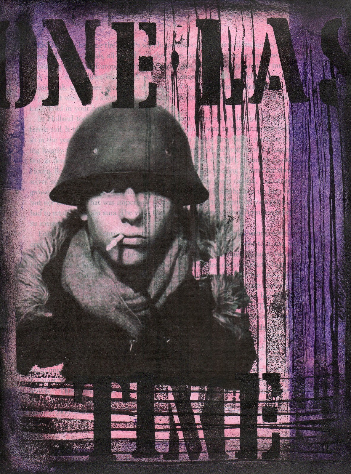 The journaling is about saying goodbye to this image of a soldier, which I like so much I've used it many times in various mixed media projects. This is the 'one last time' I'm using it, and luckily I'm quite pleased with this swansong page!
